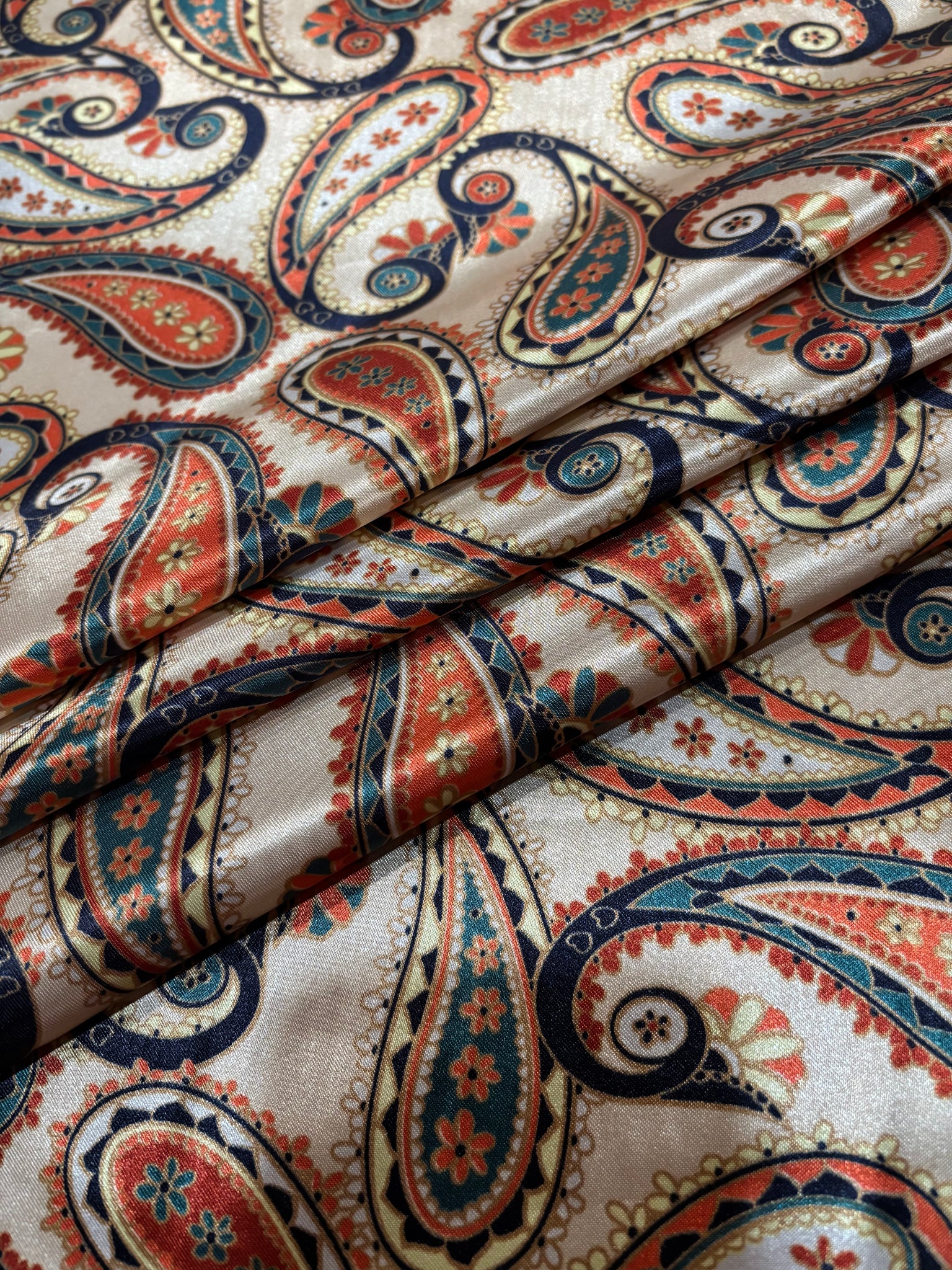 Creamy cream paisley with navy, greens, orange and a touch of gold. Silky charmeuse print.
