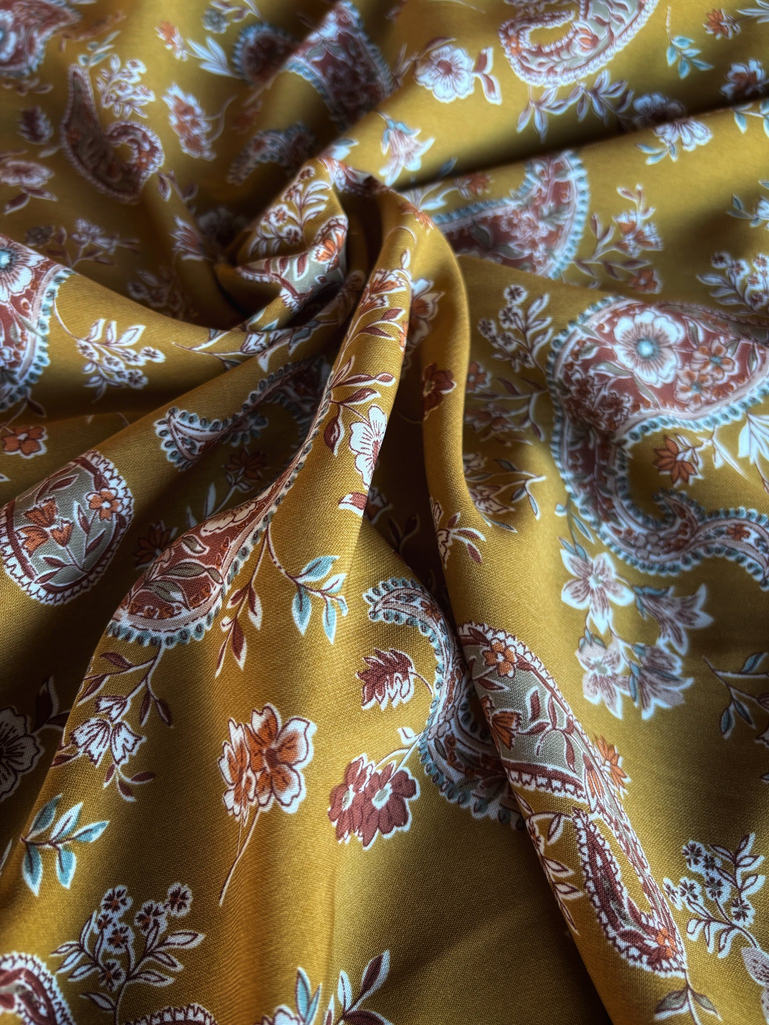 Stunning mustard, rust paisley and floral print on a soft peach skin fabric