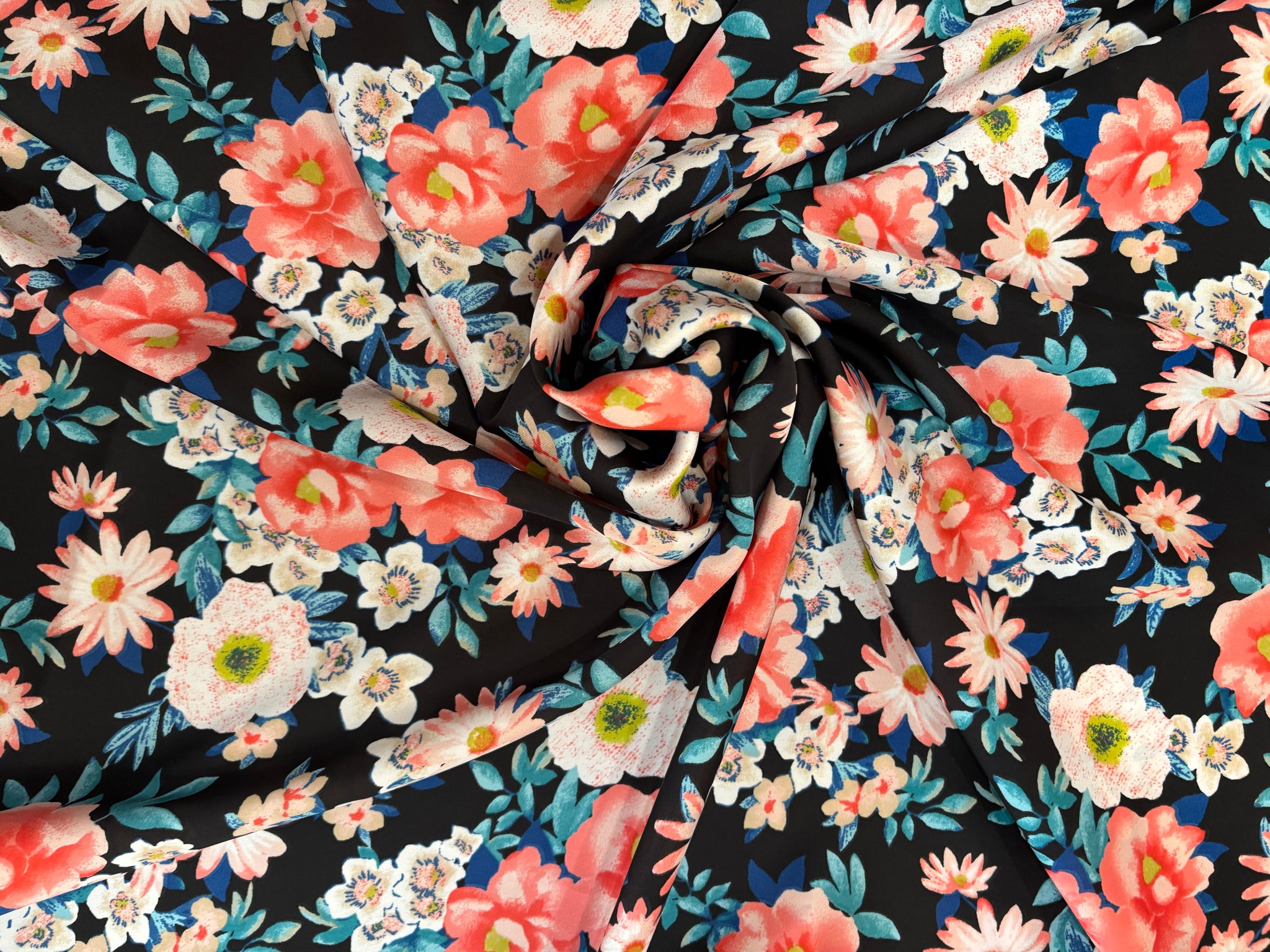 Dark navy with pink, coral, white and blue floral print on a silky satin charmeuse fabric