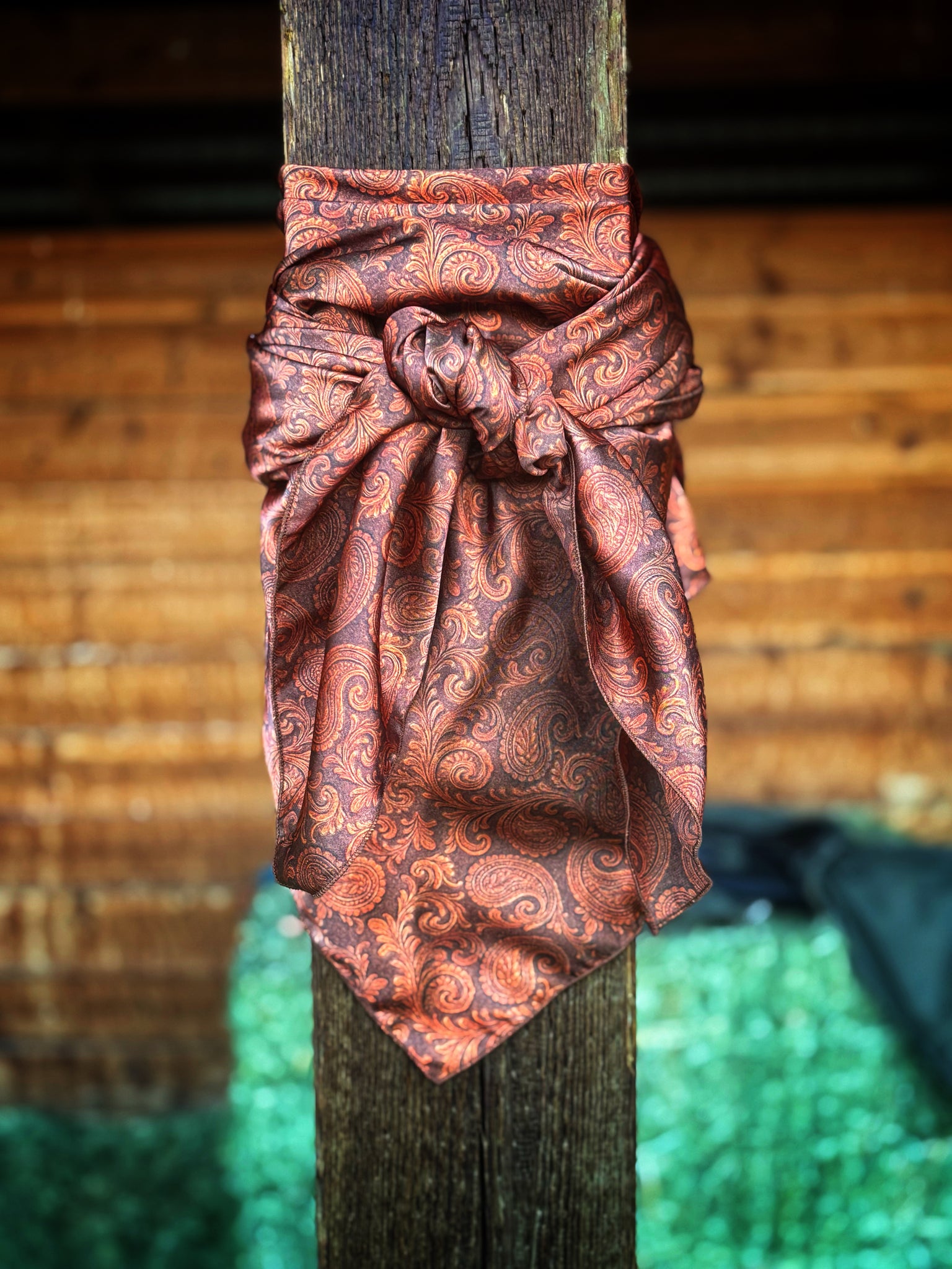 Rich brown elegant paisley pattern with warm copper tones on a silky charmeuse fabric.