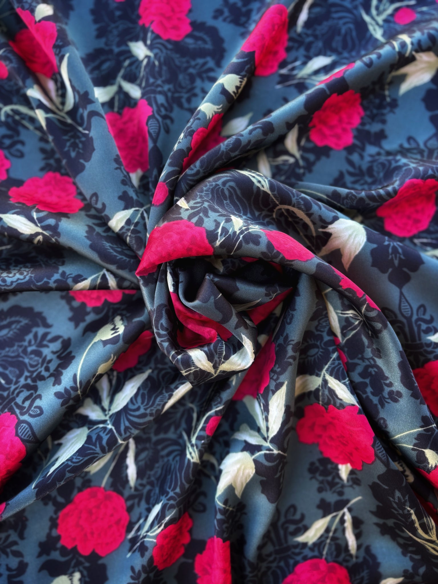 Rich grey and black tones with vibrant red roses on a silky soft charmeuse fabric.