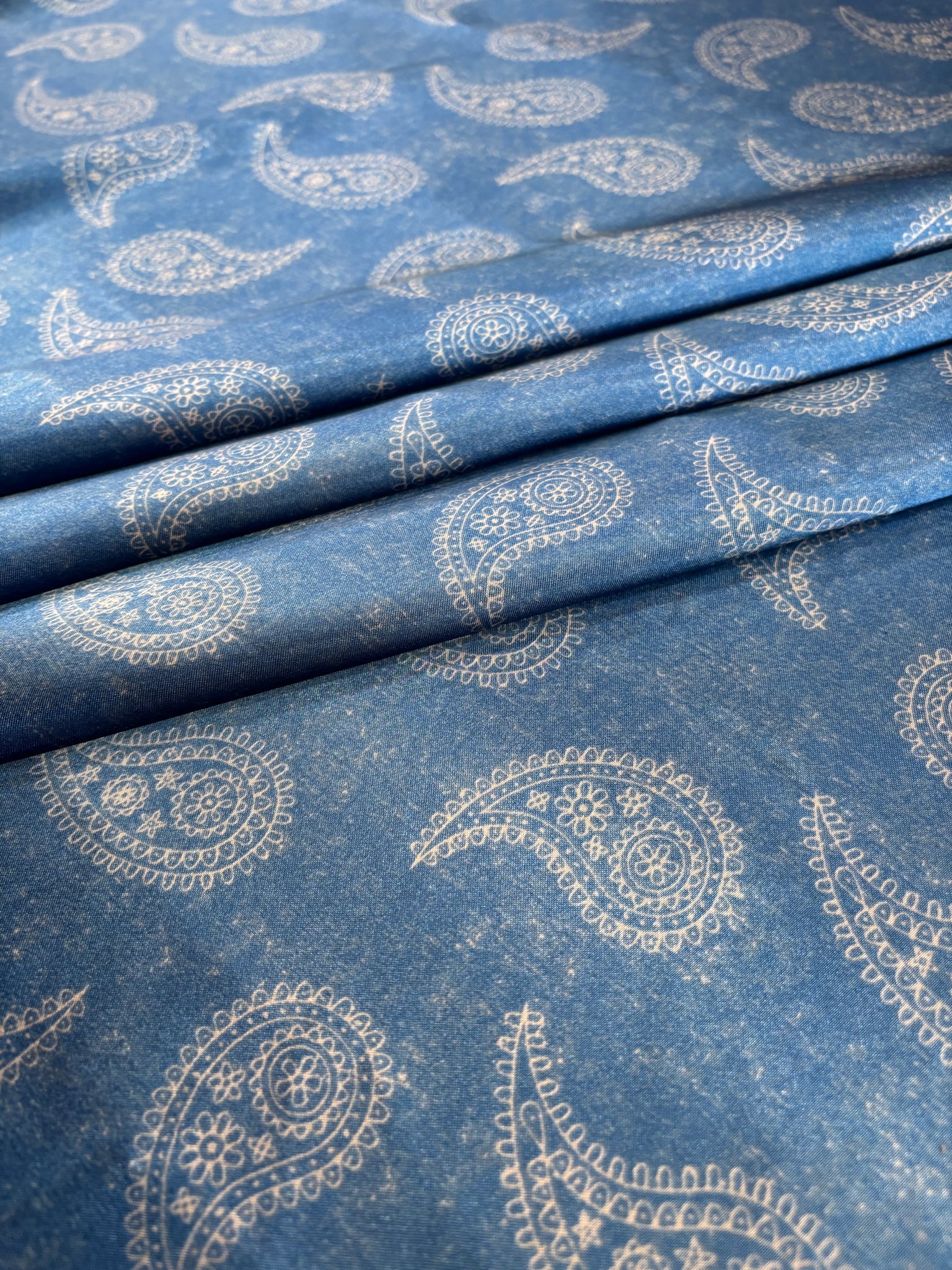 Beautiful sky blue with a white paisley design on a soft satin charmeuse fabric