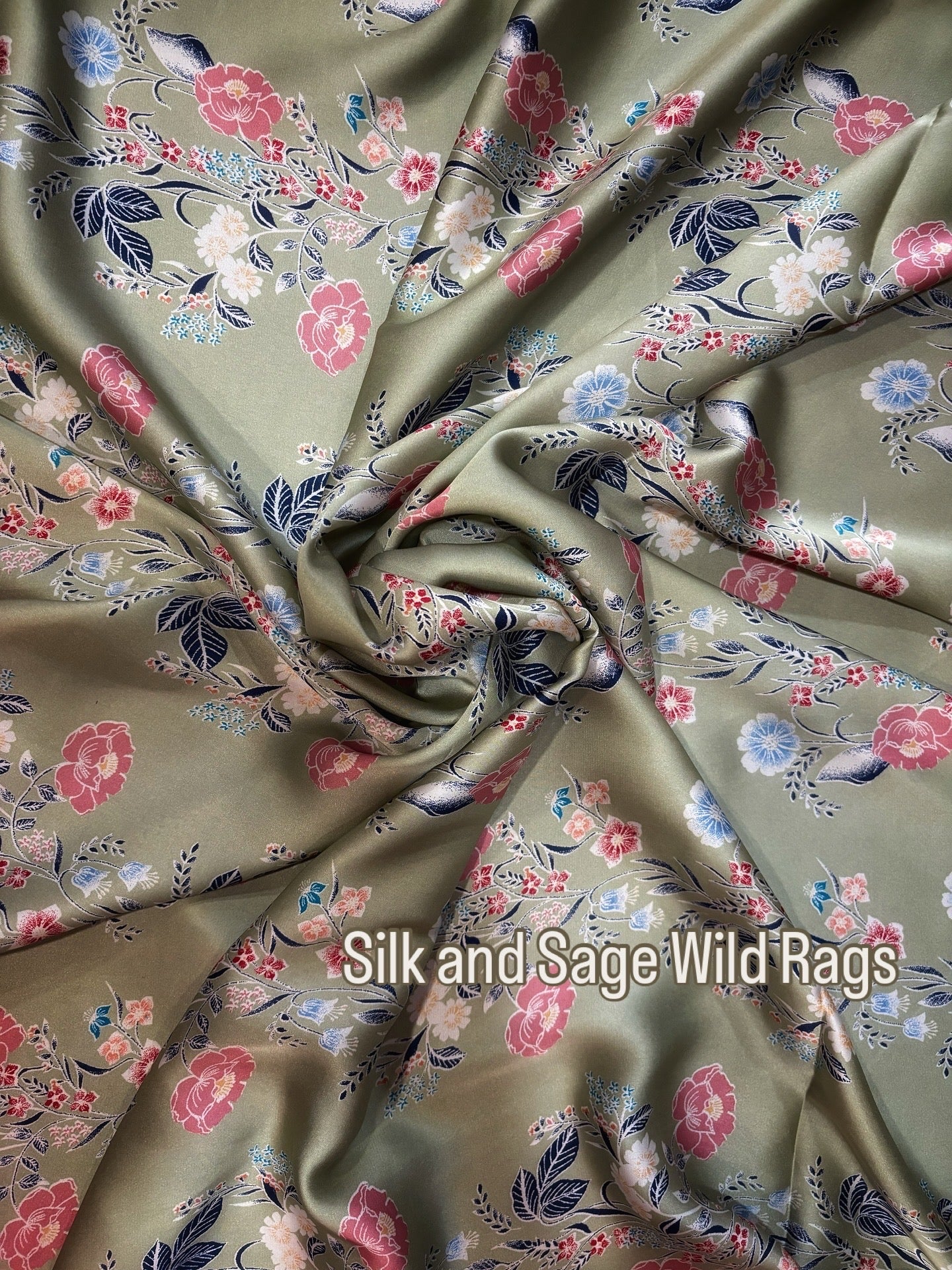 Simply stunning, light mint green with blues and pinks. Lightweight satin floral satin.