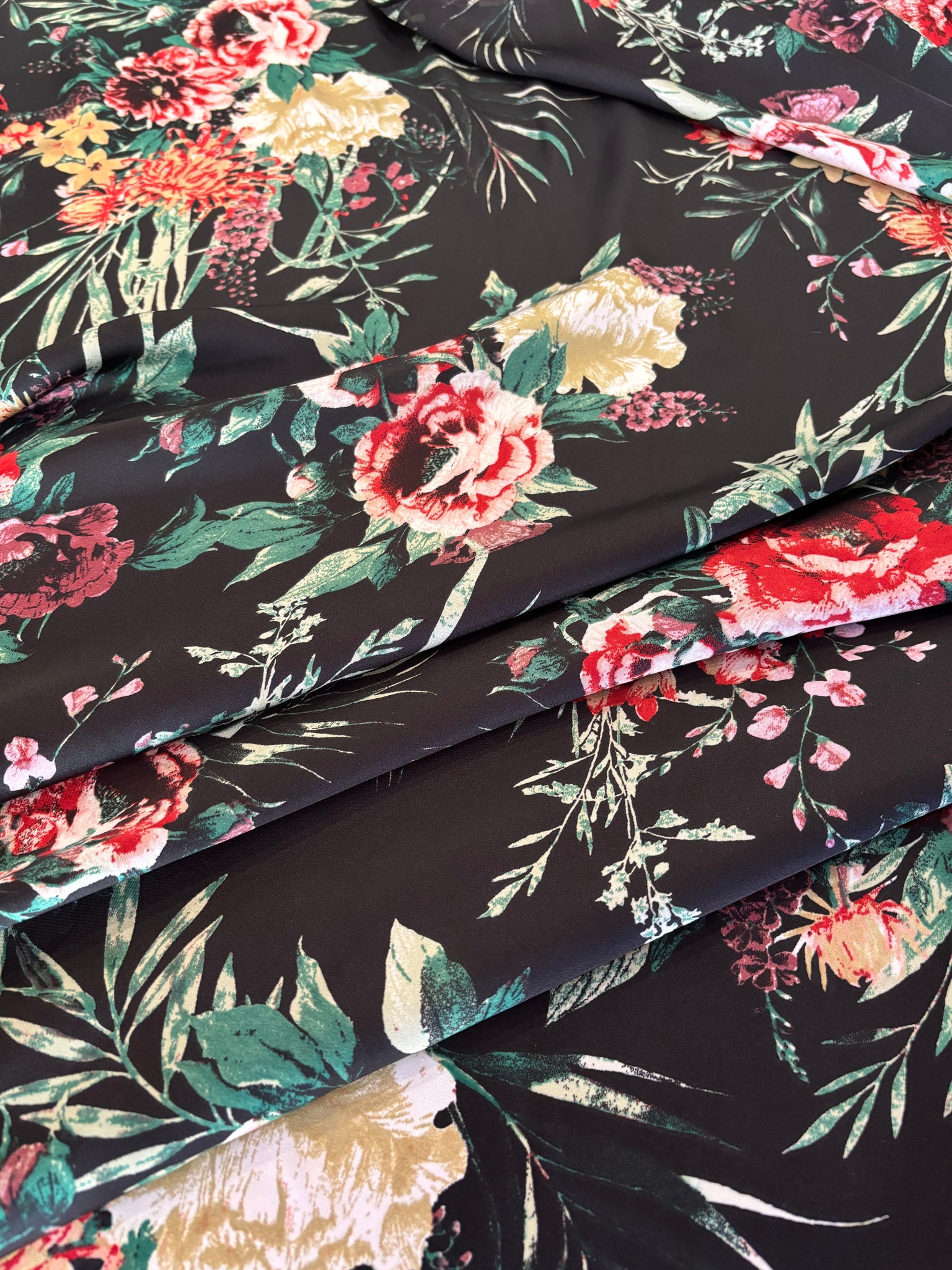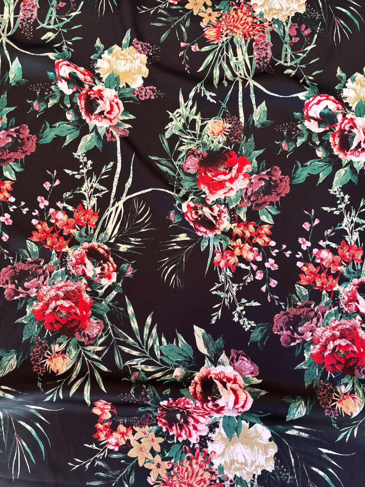 Stunning bright red, beige, green and black floral on a light satin charmeuse fabric.
